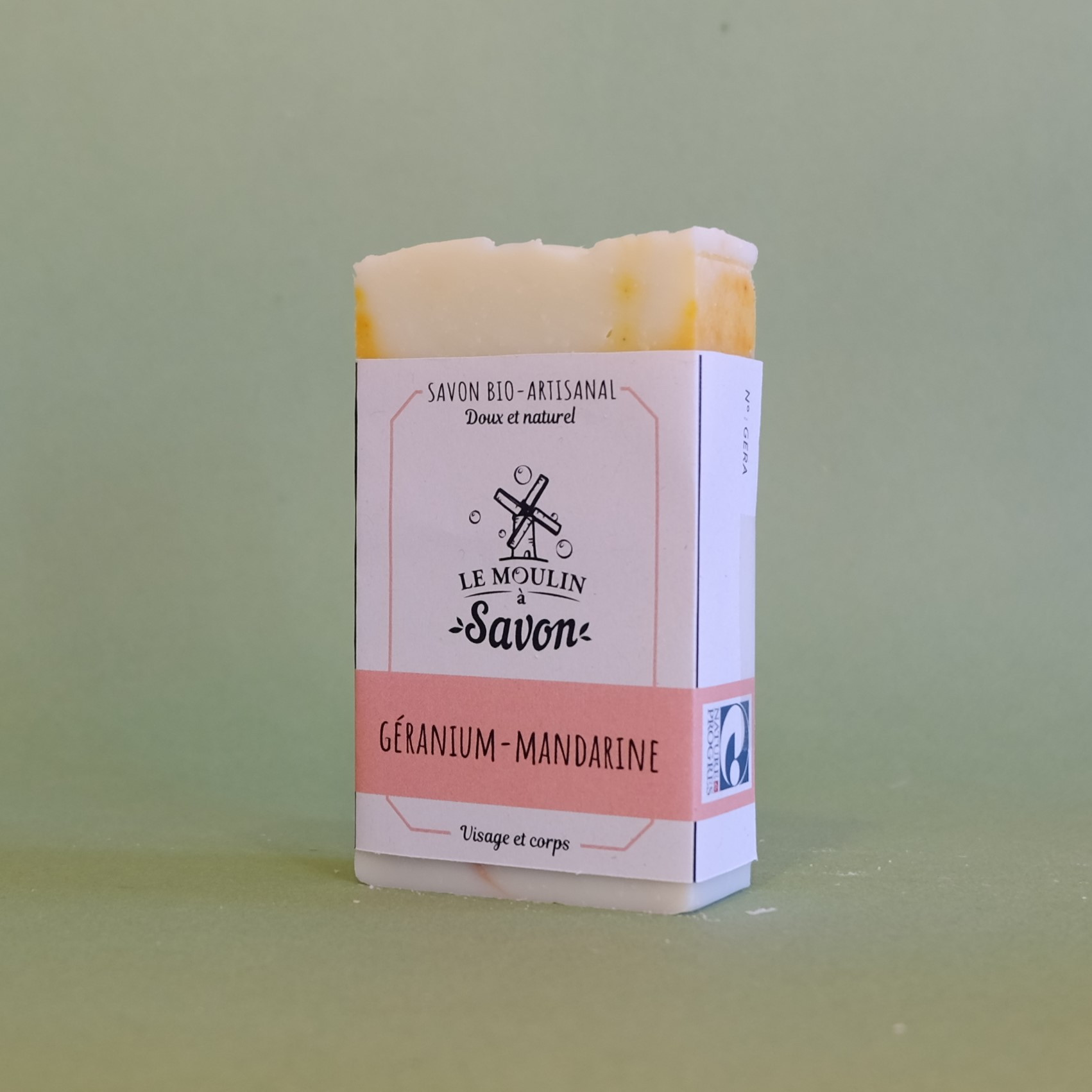Savon saponifié à froid, fabriqué à la main, certifié Nature et Progrès.